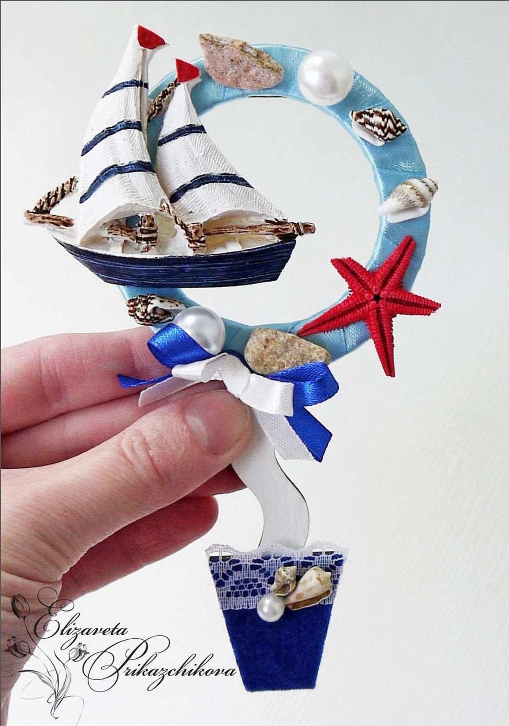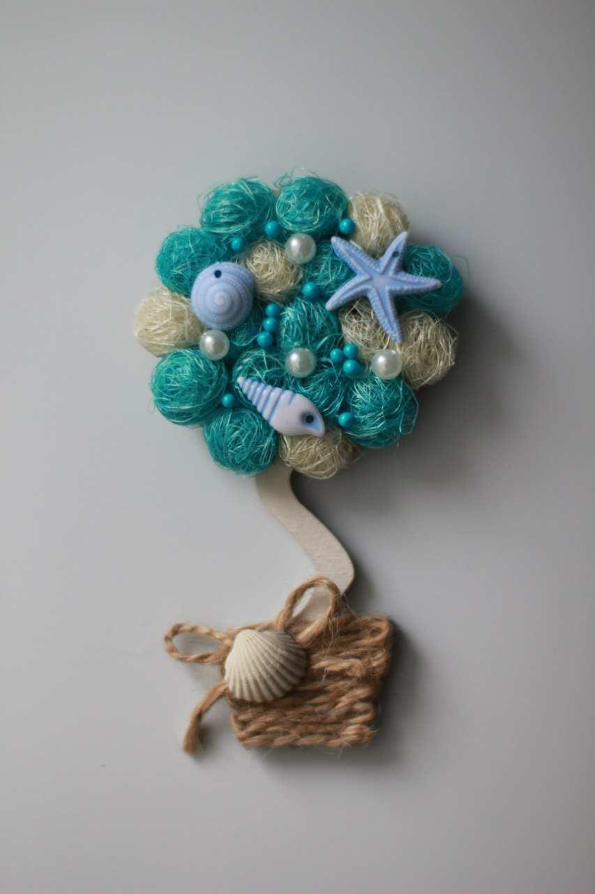 Оформление в морском стиле. Жемчуг и ракушки хорошо сочетаются с сизалевыми шариками. Особенно нежно смотрится интересный топиарий. В нем сочетаются сизаль, ленточные цветы, искусственные листья и привлекательный домик.