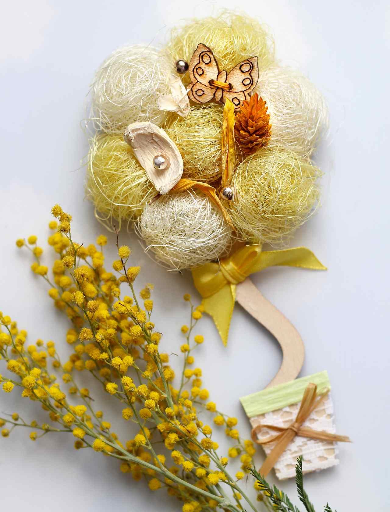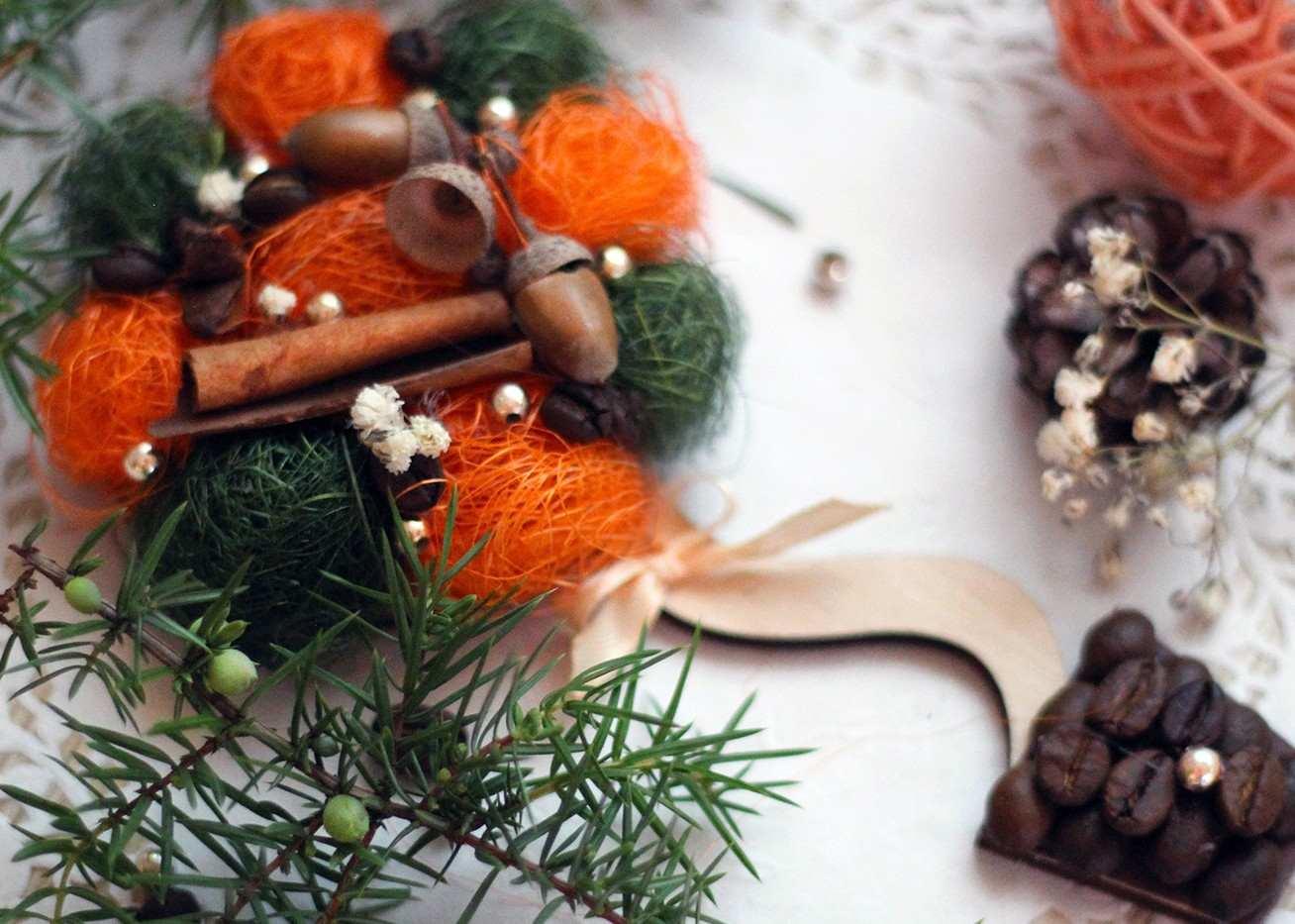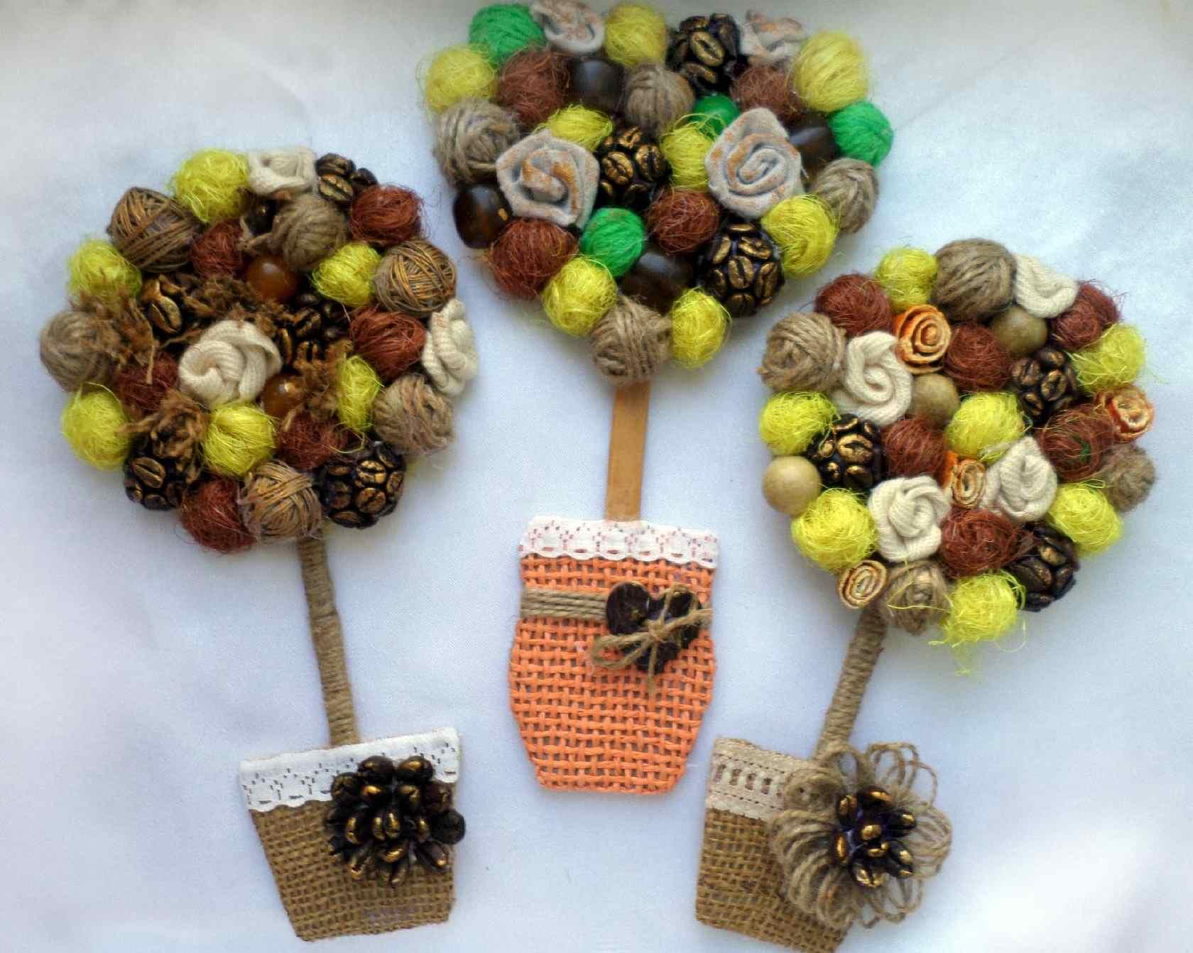 В большинстве случаев сизалевые шарики используются для заполнения всех пустот в коронке. Так изделие выглядит более полным и объемным. Материал легкий, поэтому ствол дерева не перегружается.