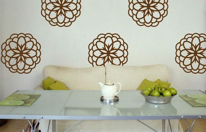 Трафареты декора, которые вы выберите, полностью зависят от технологии рисунка. Для новичков подойдет простой вариант, на котором изображены цветочные мотивы. Стоит отметить, что они могут являть собой как абстракцию, так и естественную композицию, что делает их универсальными при использовании в любом стиле комнаты.