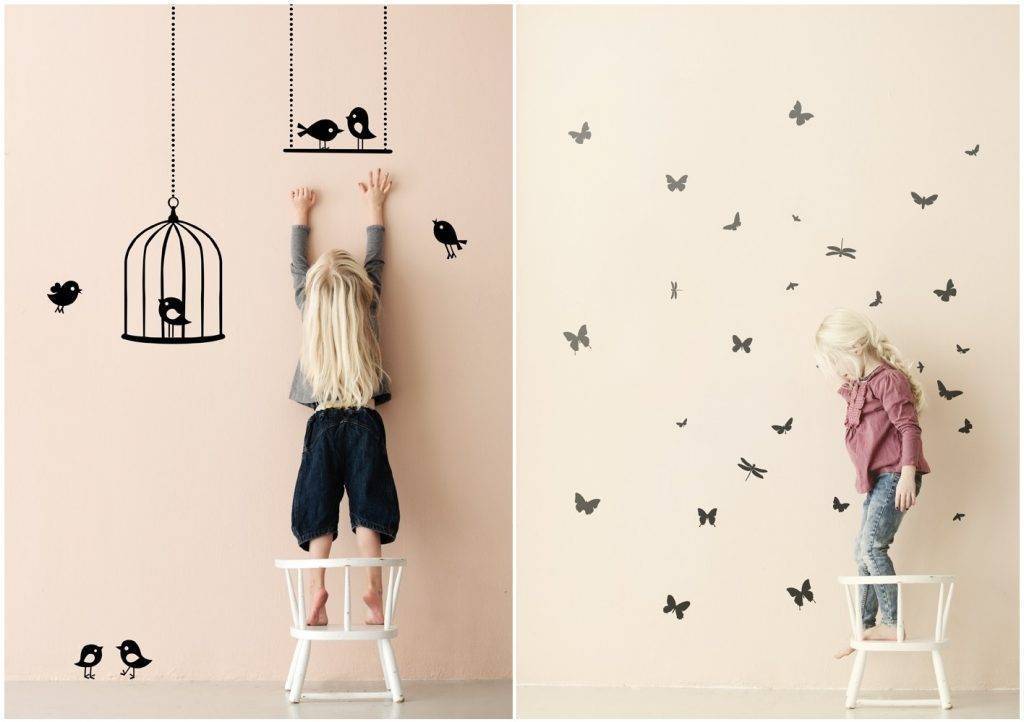 Если вы поклонник всего не традиционного и оригинального, вам не стоит даже задумываться об использовании обычных геометрических или цветочных узоров. Лучшим вариантом станут трафареты, на которых нарисованы различные животные, в том числе и кошки. Забавные мордашки станут прекрасным украшением не только стен, но и фурнитуры. С помощью таких трафаретов вы можете украсить не только спальню или детскую, но даже собственный холодильник. Кроме анималистических мотивов вы можете использовать аппликации с бабочками. Если вы не умеете рисовать этих насекомых самостоятельно, используйте готовый шаблон из интернета. Останется только распечатать его, хотя на сегодняшний день дизайнеры предлагают даже готовые виниловые наклейки, которые не придется в дальнейшем обрезать или разрисовывать.