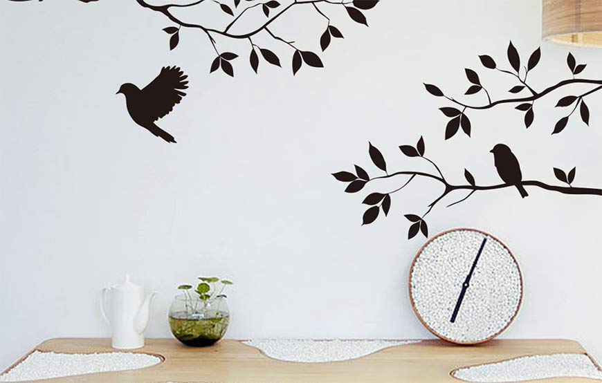 - Природа — цветы, листья, деревья, растения. Небольшими повторяющимися мотивами можно украсить комнаты любой площади, а габаритные картины подходят только для просторных помещений. Некоторые элементы можно выделить на стене резной рамкой.