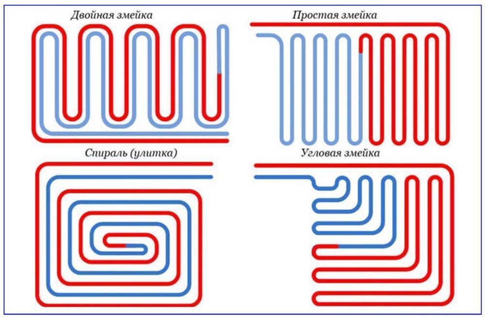 Производители выпускают трубы 16 мм – наиболее оптимальный вариант для установки системы. Подходящими схемами настройки теплового пола считаются змейка и улитка. Горячая вода при планировании – красная, холодная обозначается голубым цветом.