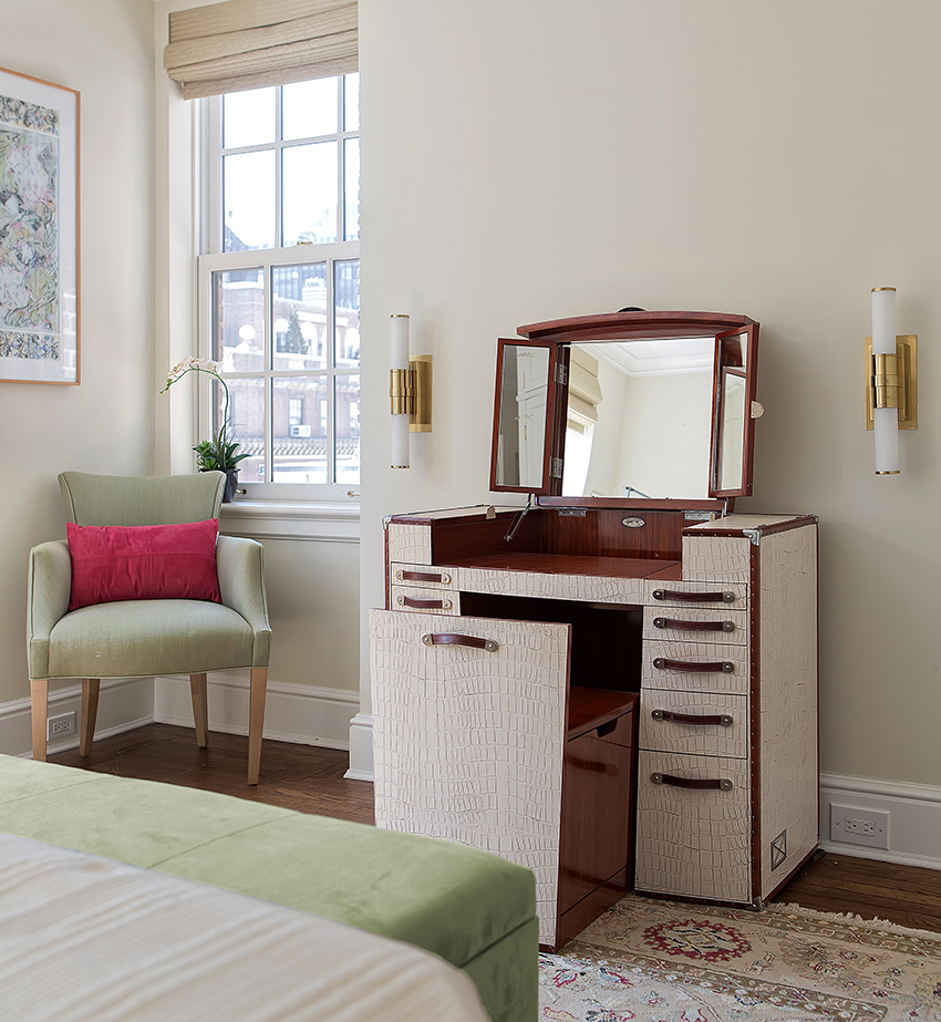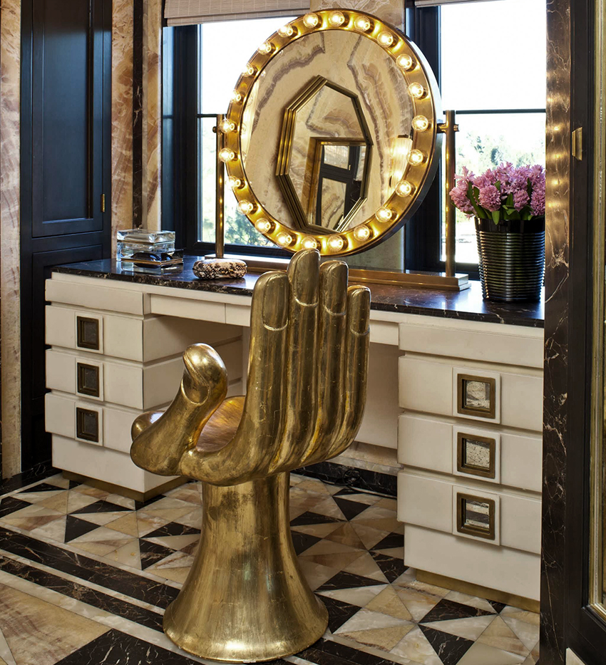 Роскошный туалетный столик с необычными изгибами и оригинальными формами, дополненный пуфиком, является неотъемлемым элементом яркого и немного экзотичного арт-деко.