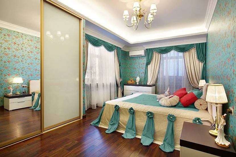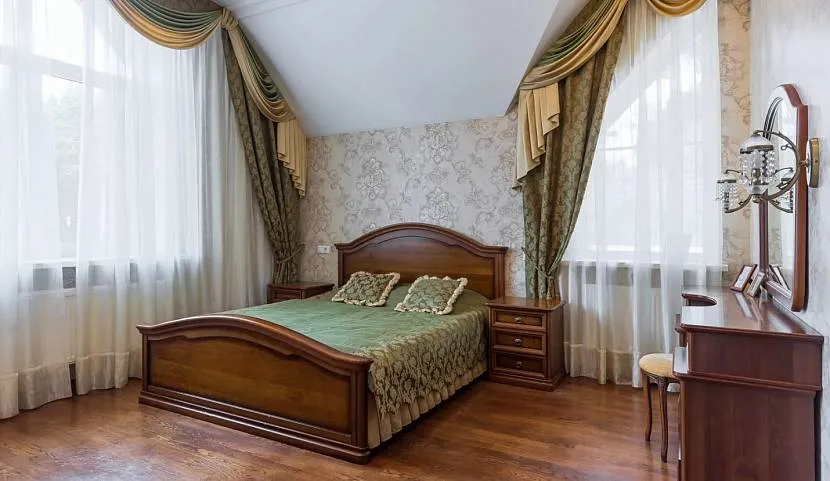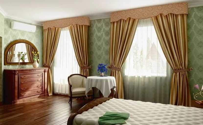 Традиционный для спальни вариант ― тяжелые раздвижные портьеры из плотного шелка с ламбрекеном из той же ткани и шелковый тюль. Их украшают бахромой, кистями и собирают по бокам прихватами или заколками.