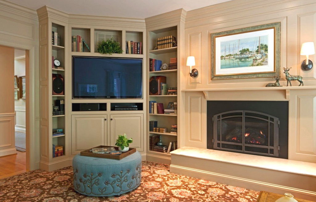 Сейчас очень популярны конструкции с угловыми шкафами. Они являются прекрасным решением для обладателей небольших помещений. Такие предметы мебели также прекрасно вписываются и в просторные гостиные. Конкретный размер конструкции будет зависеть от количества секций. Некоторые таки модели даже включают отделение для камина. Это очень интересное и функциональное решение для гостиной.