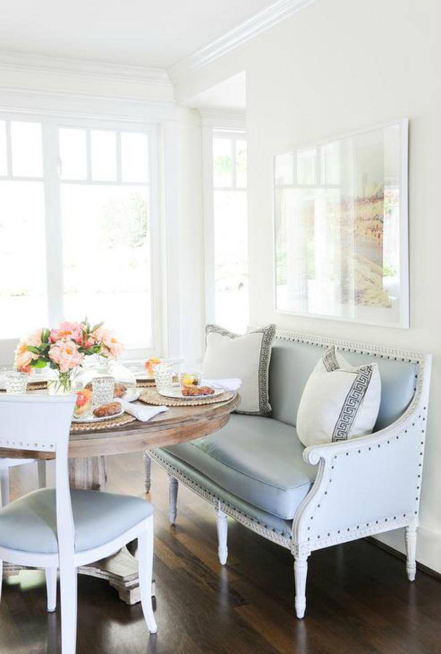 На фото интерьер кухни в стиле прованс с деревянным диваном-скамейкой белого цвета.