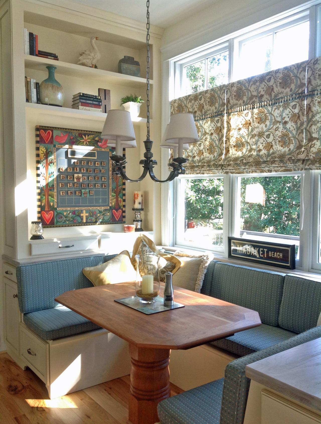 На фото кухонный уголок, декорированный подушками и каретной стяжкой.
