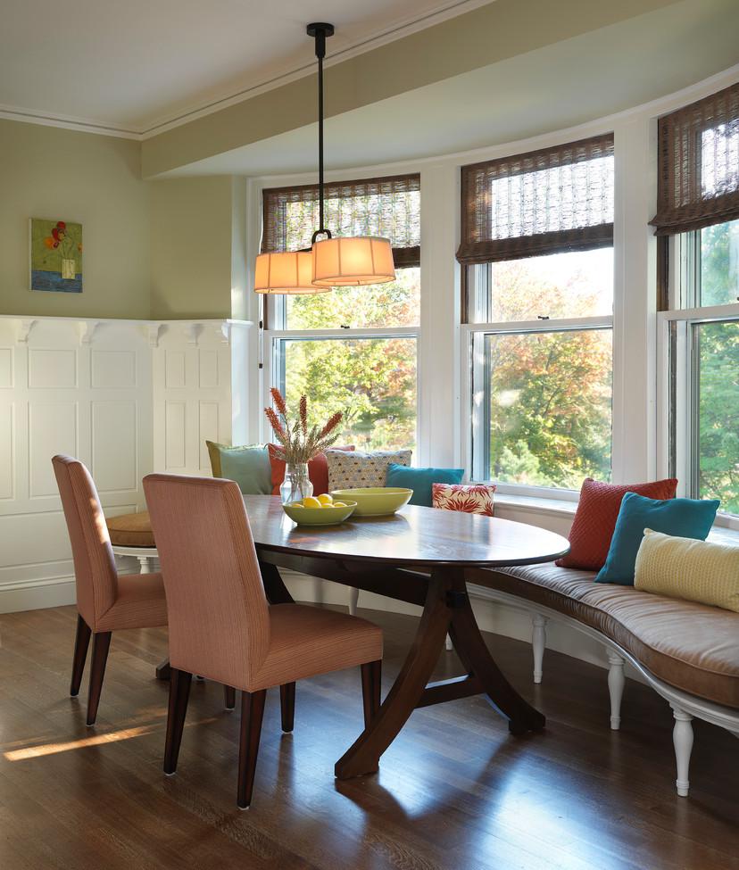 На фото интерьер кухни с диваном светлого оттенка, расположенным в эркерном выступе.