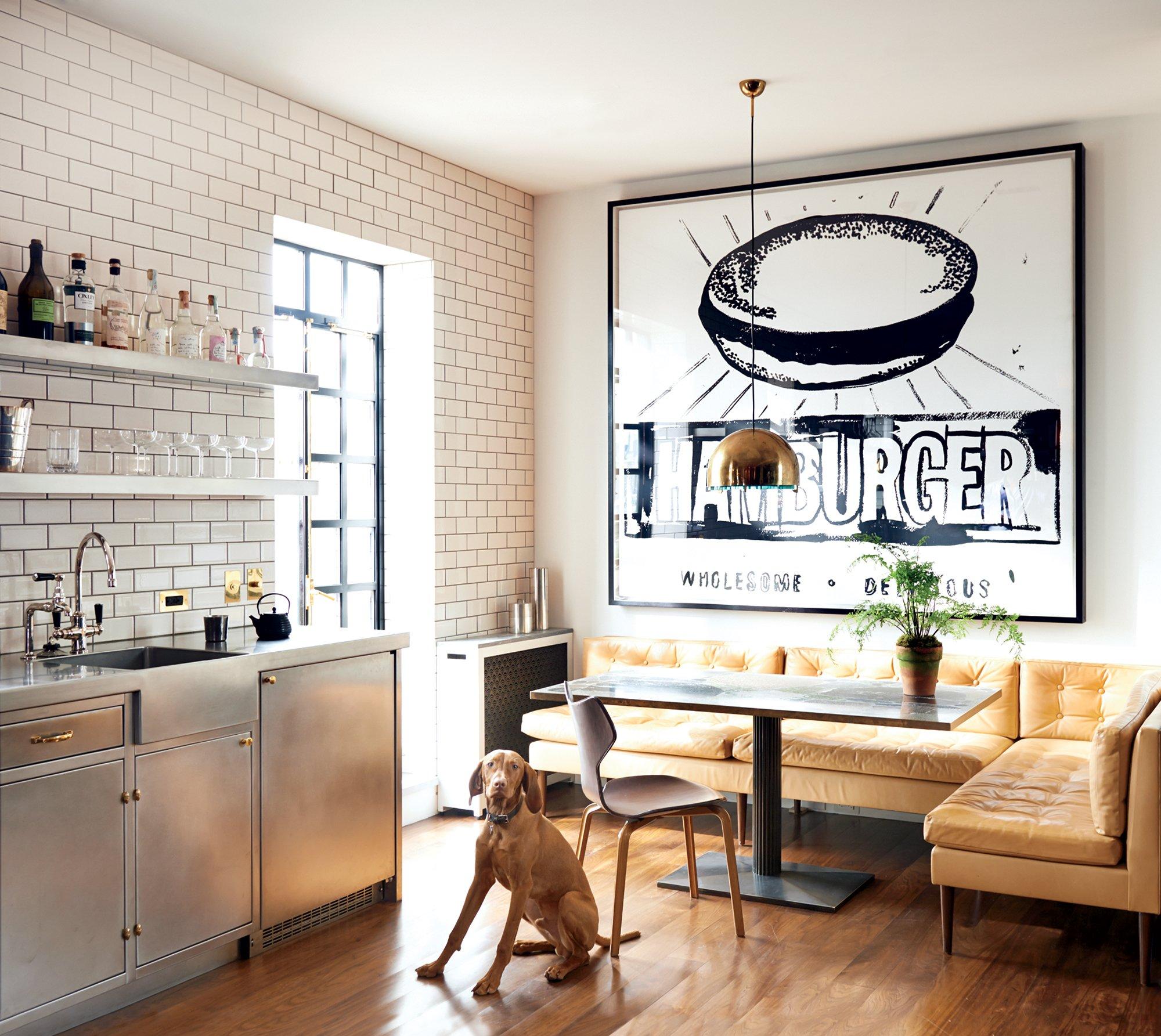 На фото современный кухонный интерьер с угловой мягкой обеденной зоной, обитой кожей.