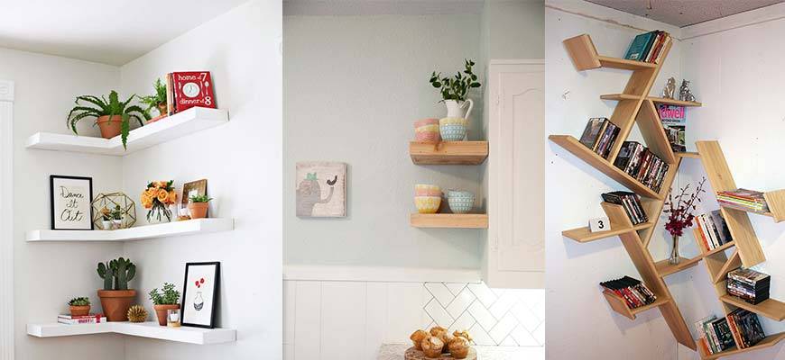 Если принято решение функционально использовать угловую зону, подобрав для нее угловую полку, следует внимательно изучить виды конструкций. Их существует большое количество. Наиболее простые представляют собой 2 опорные детали и дощечку, привинченную к ним сверху. Создать подобную мебель может даже начинающий мастер, имея под рукой набор простых инструментов.