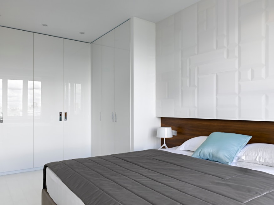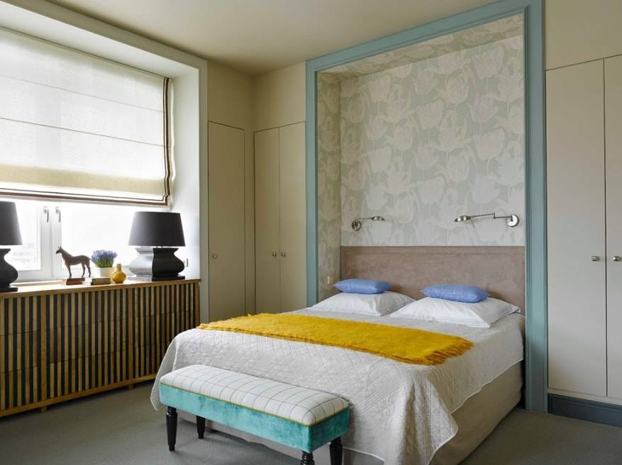 Отдельно нужно отметить узкие спальни. В этом случае лучше ставить кровать перпендикулярно длинной стене, чтобы визуально нивелировать недостатки помещения. Исключение составляет лишь тот случай, когда при такой расстановке мебели расстояние до стен остается менее 70 см.
