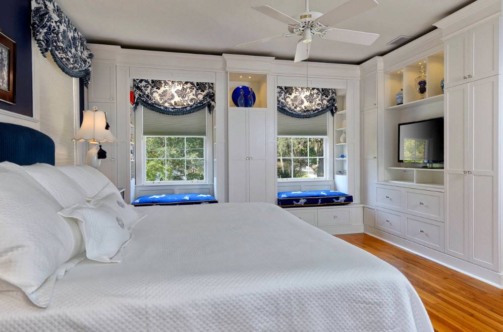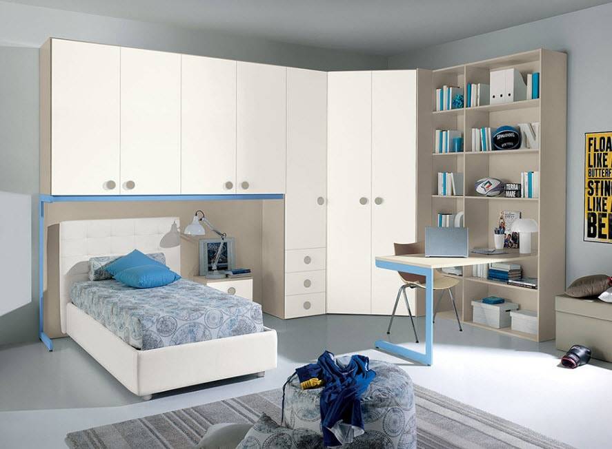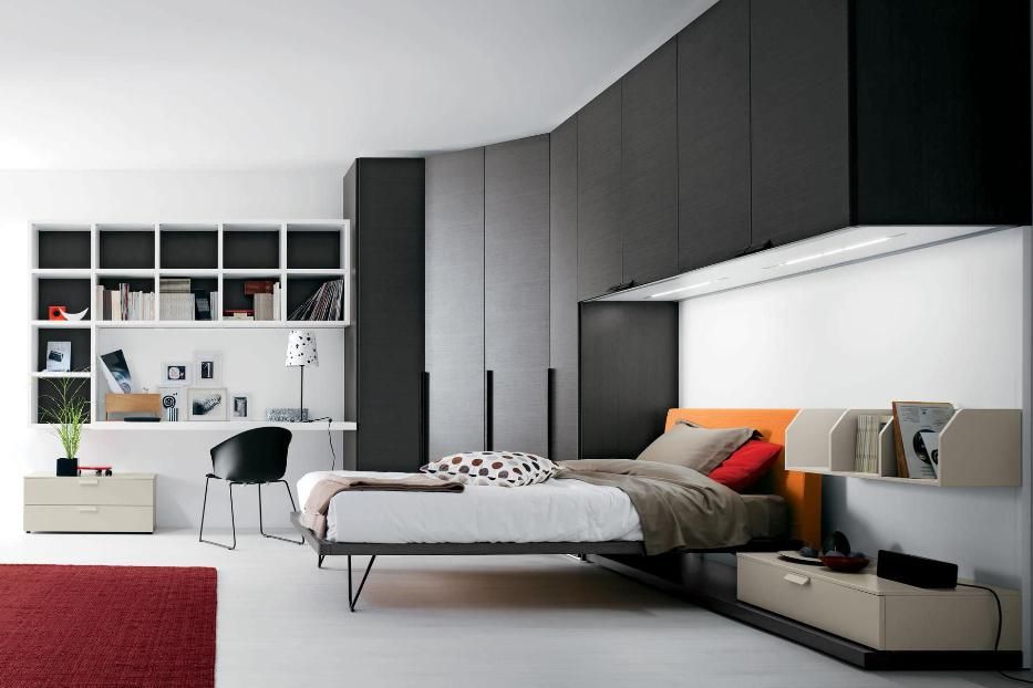 Во-первых, нужно создать как можно больше мест хранения, причем задействовать для этого обычно неиспользуемое в этих целях пространство. Так, всю кровать можно окружить стеллажами, использовать для хранения вещей и постельного белья пространство под кроватью, но в этом случае необходимо заранее подобрать модель кровати с вместительной нишей. Таким образом, выигрывается место, и от комода можно отказаться. В крайнем случае, можно организовать над кроватью небольшую полочку для хранения самых необходимых вещей.