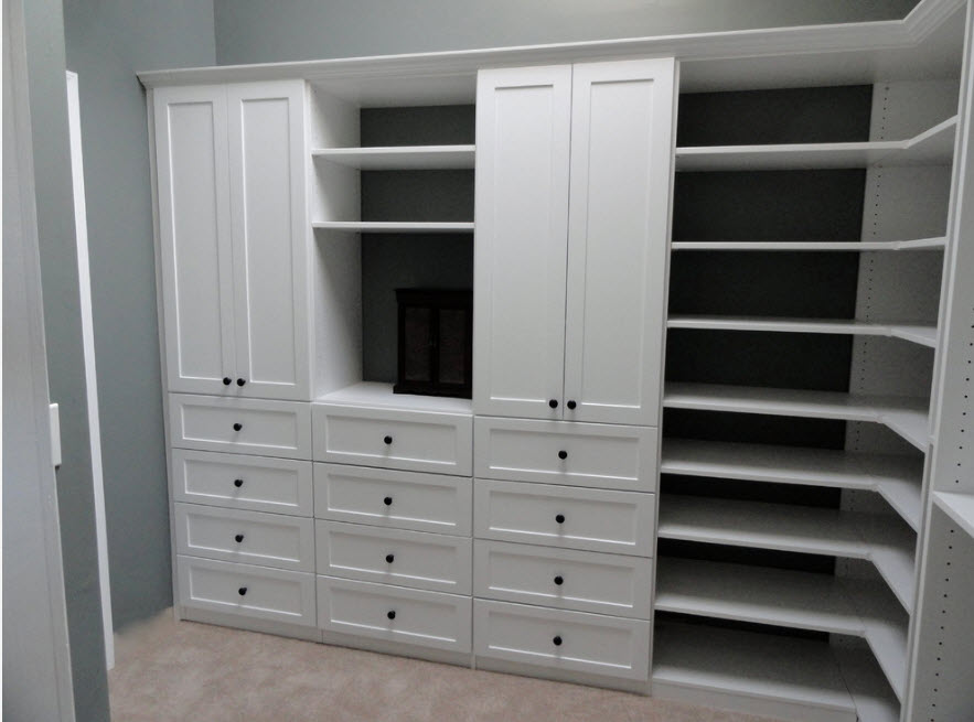 Стандартные модели оборудуются антресолями, секциями с перекладиной и с полками шириной 45 см. В самом низу могут находиться открытые полки для габаритных и тяжелых вещей или выдвижные ящики.