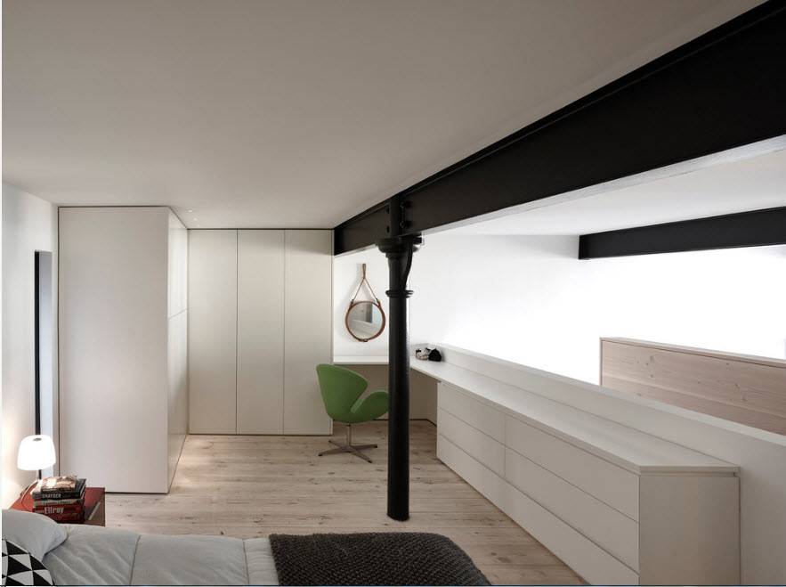 Если не помещается даже самый компактный шкафчик, то заменить его можно вешалкой-штангой, чтобы вешать на нее самые необходимые предметы. Интересное решение – организация подиума: так можно выделить кровать, да и дополнительное место для хранения появляется внутри подиума. Еще один вариант – мебель-трансформер. Она хоть и стоит дорого, но для некоторых спален – единственное решение. Это может быть кровать, убирающаяся в шкаф или другие интересные решения. Для небольшой спальни готовый комплект мебели не очень подходит, так как может просто не поместиться, а вот модульная мебель – то, что нужно.