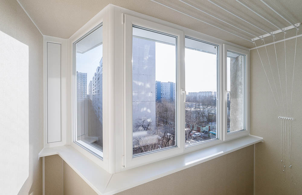 - Угловое окно с закреплённым профилем ПВХ, к которому крепятся рамы со стеклопакетами или листы стекла для панорамного остекления, — оптимальный выбор для тех, кто особенно ценит свободное пространство.