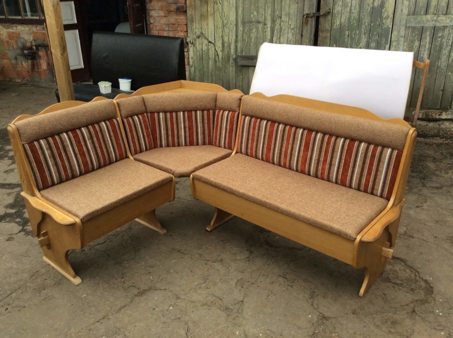 «Этюд» (16 500 рублей). Сочетается с разными стилями обстановки. Длина угла 2,05 м, изготавливается из ЛДСП, массива дерева и ткани. Размеры готовых изделий разнообразны, что позволяет подобрать оптимальный дизайн под свою кухню. Есть упрощенные модели без шкафчиков или угловой секции. Мягкие части уголка могут быть наполнены как пенополиуретаном, так и синтетическим пухом.