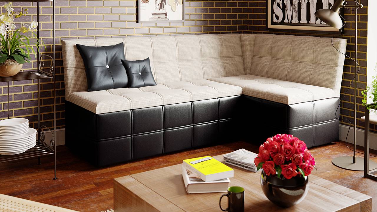 «Квадро» (20 600 рублей). Надежный уголок длиной 2,1 м. Предполагает различные материалы – МДФ, ЛДСП, фанеру, экокожу, текстиль. Тип угла универсальный. Выполнен в сдержанной гамме оттенков, а его дизайн простой и неброский. Присутствуют вставки из светлой ткани, но судя по отзывам, она неприхотлива в уходе.