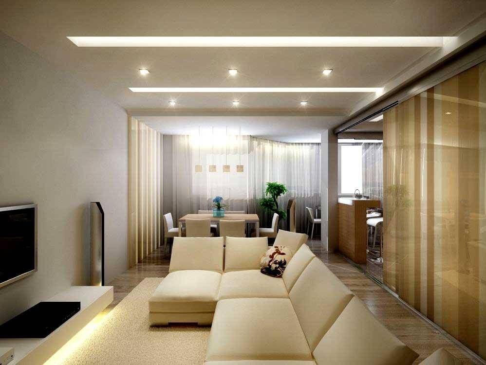 Продуманное освещение на подвесном потолке Планировка просторной однушки может быть выполнена с помощью света, а также отделочных материалов