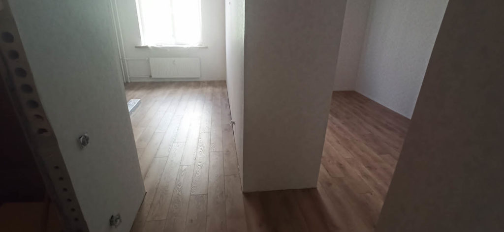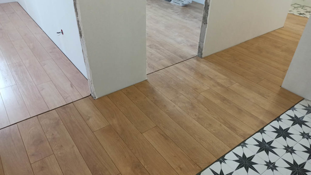 - Ламинат, кварцвинил, замковая паркетная доска — это плавающие полы. Они не крепятся к основанию и у стены обязательно остается расстояние на увеличение. Расстановка тяжелой мебели по краям поверх уложенного без порогов покрытия может влиять на невозможность расширения настеленного ламината. И при поперечной укладке соблюдение пропорции 8 на 6 или иное, указанное производителем, актуально. По этой причине в 2-х комнатной квартире, в форме буквы Ш, крайнее помещение — обычно это кухня с тяжелым гарнитуром, разделяем порогом для снятия поперечной нагрузки. Помня при этом, что производитель рекомендует каждое помещение разделять разрывом под порожек.