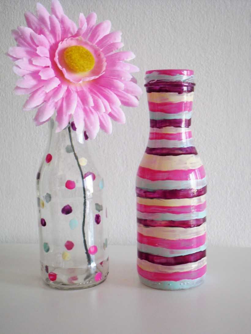 Для создания такой поделки можно использовать обыкновенную бутылку (лучше стеклянную). Она обматывается шпагатом или атласными лентами, украшается искусственными цветами, стразами, бусинками, разрисовывается красками или декорируется солью, нанесенной на слой клея.
