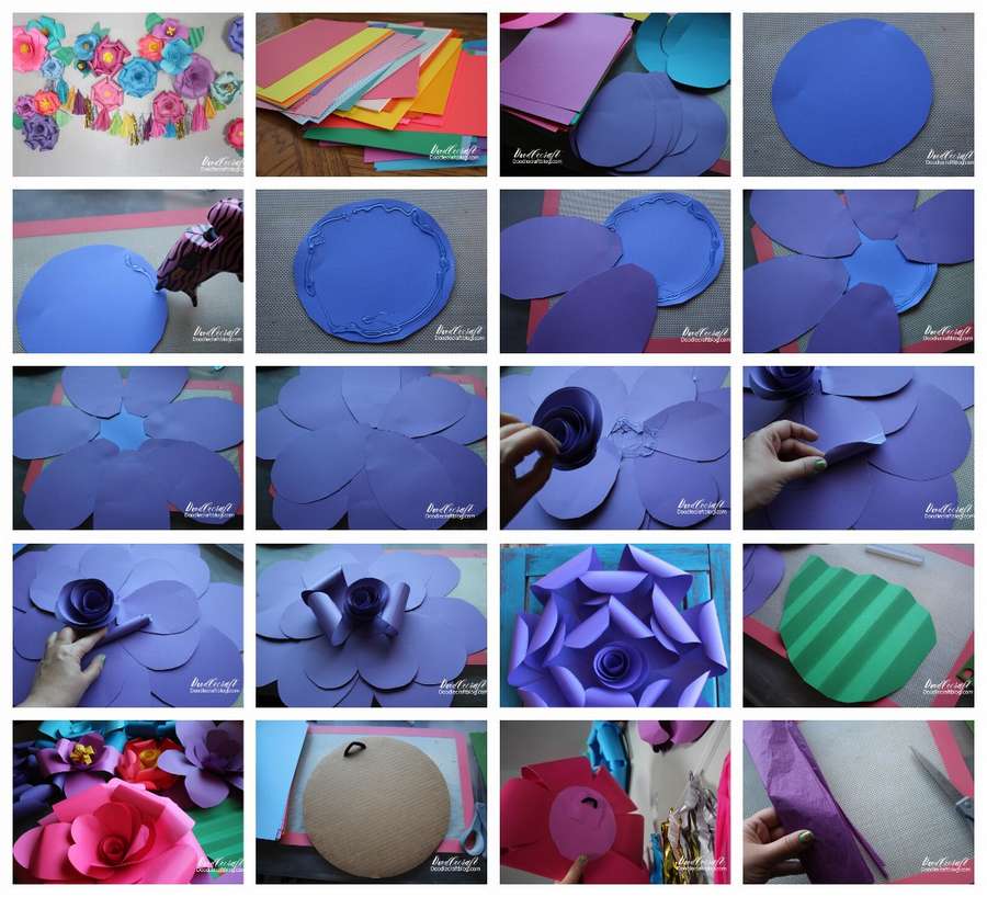 Но тогда цветок из бумаги не будет таким объемным. Сложите все полоски вместе в квадрат по схеме в галерее, а затем проткните две дырки и соедините их проволокой с обратной стороны, это будет задняя сторона вашего бумажного декоративного цветка. Вырежьте любую форму – это будут лепестки цветка, форма может быть любая.