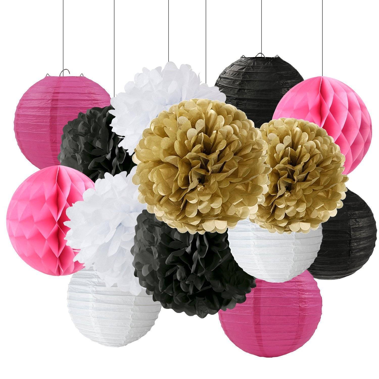 - большие бумажные цветы, шары и соты на разных уровнях.