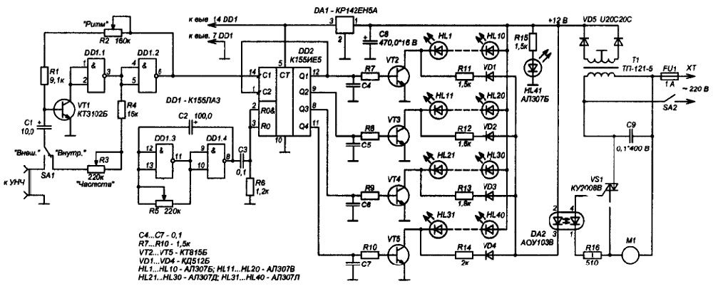 Кнопка SA1 предназначена для выбора светодинамических режимов работы системы. При каждом кратком нажатии включается следующий световой эффект. В простых контроллерах обычно запрограммировано 8 вариантов свечения гирлянды.