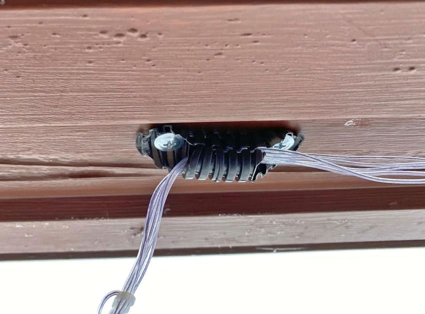 Крючки с самоклеящимися клипсами можно заменить трапециевидными отрезками черной гофрированной трубы для протяжки кабельных изделий. Форма обоснована тем, что выступающие края легко закрепить саморезами к деревянному основанию. Решение как повесить уличную гирлянду на дом – вдоль заготовок длиной 50-60 мм нужно сделать прорезь. Через нее легко вставляется тонкий проводник иллюминации. Если импровизированный крепеж установлен скрыто под навесом, то его можно оставить для последующего украшения фасада подсветкой.