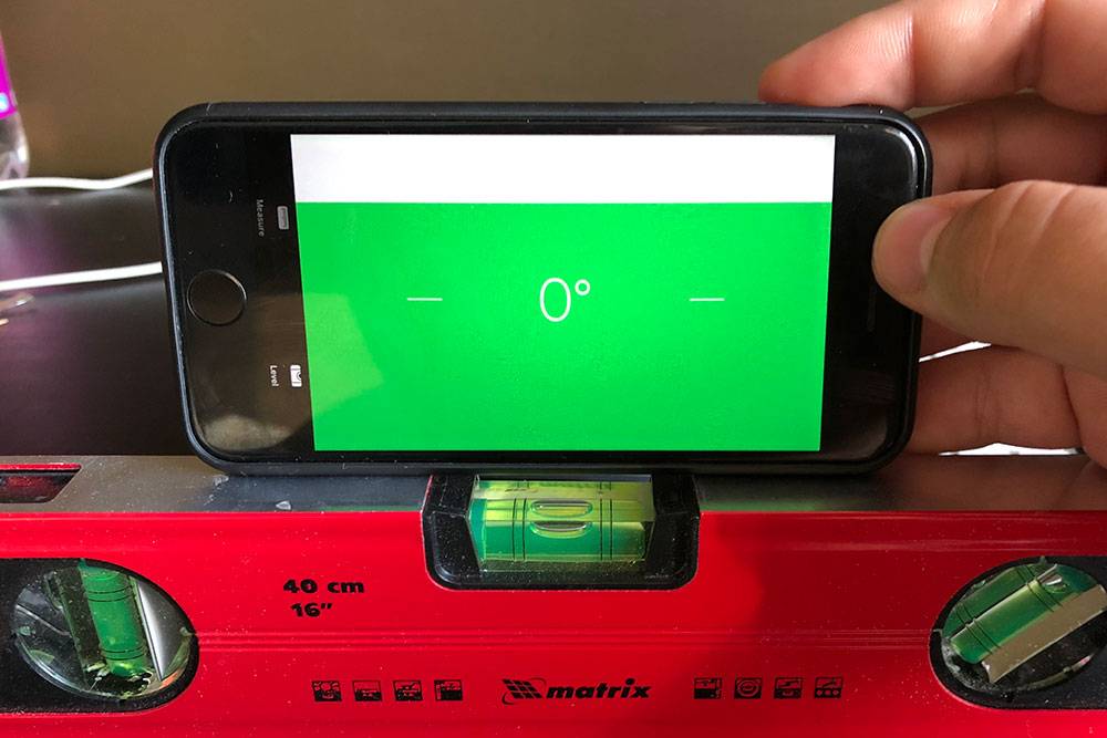 Сверху — уровень на Айфоне. Я приставил его к столешнице и вижу, что она не наклонена по отношению к земле — угол 0°. Снизу — строительный уровень. Когда овальный пузырек четко между двумя линиями — наклона нет