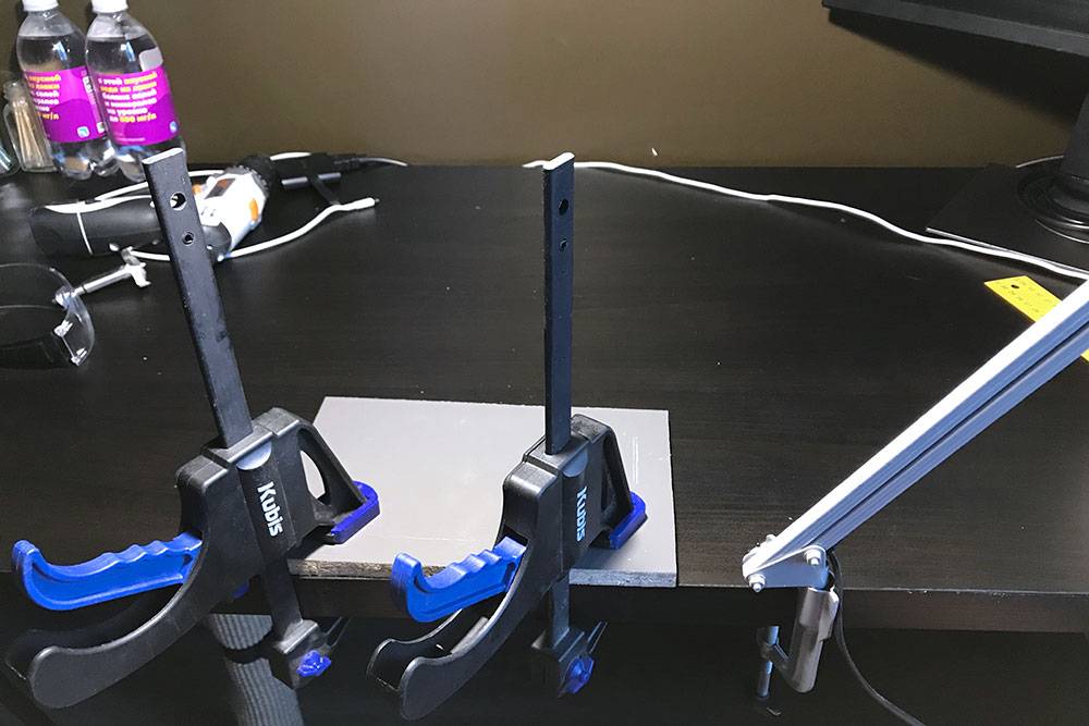 Крайняя справа — ручная струбцина с гайкой. Она шла в комплекте с лампой. А когда я собирал кухню, пользовался струбцинами слева. Чтобы что-то стянуть, нажимал на синие рычаги