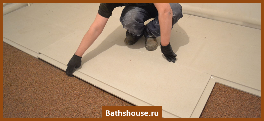 При устройстве сухой стяжки направляющие не нужно вынимать. Сразу после засыпки гранулированного материала и его разравнивания на профили укладываются листы фанеры, ОСБ, ГВЛ или ДСП и прикручиваются к ним при помощи саморезов.