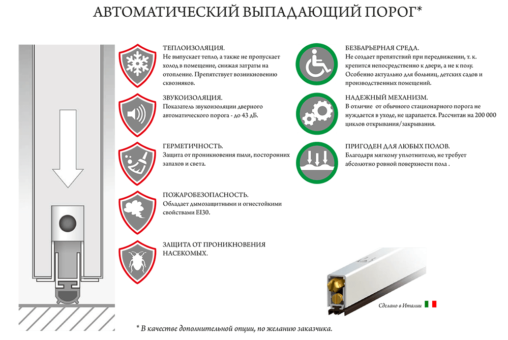 Выпадающая планка отличается простой и бесшумной конструкцией. В закрытом состоянии проема она перекрывает пространство между полом и нижней частью двери, а в открытом — убирается в специальные пазы. Автоматический порог — техническое соединение алюминиевого профиля, резинового уплотнителя и торцевой кнопки, при нажатии на которую срабатывает механизм выдвижения устройства.