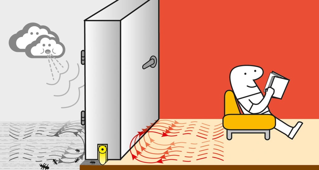 - под дверные петли вставляет полоса металла со специальной кнопкой, которая вдавливается при закрытии двери. В это время срабатывает пружина, опускающая полосу уплотнителя из резины, надежно закрывая щель под дверью;