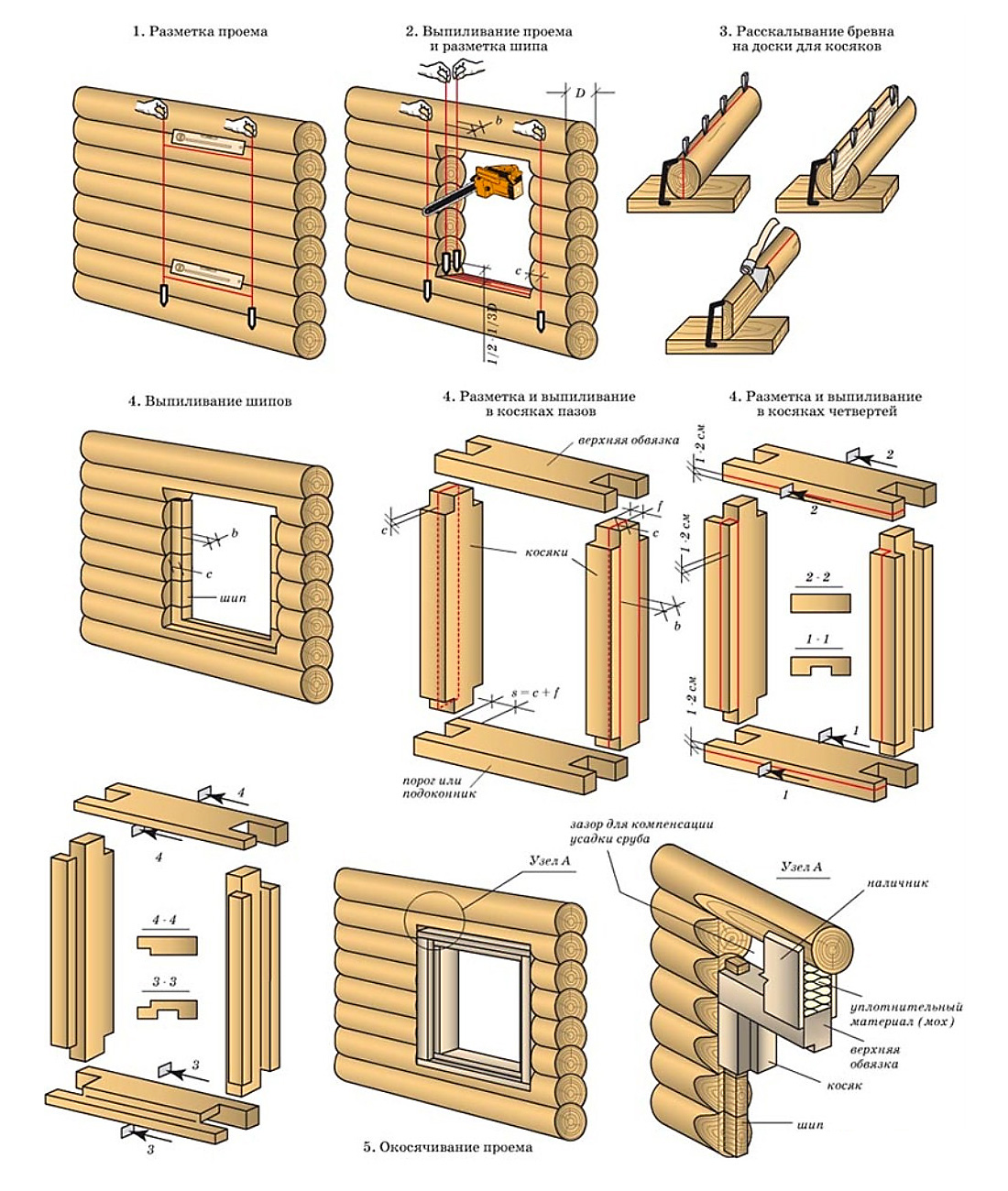 В оконном проёме выпиливается шип (гребень), на который потом одевается оконный “лафет” или колода. Именно такой вариант окосячки называют обсадой с колодкой.
