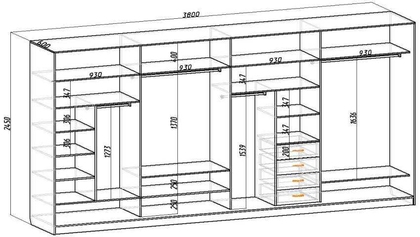 После того как определились с габаритными размерами, глубиной и количеством дверей, нужно разобраться с внутренним наполнением шкафа, т. е. с перегородками, полками и их расположением.