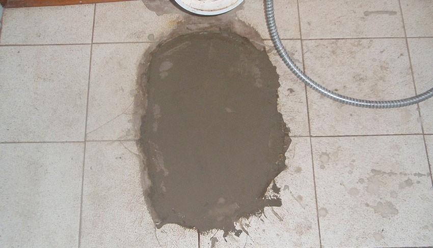 Далее готовят цементный раствор и заполняют им углубление в кафельном полу. После чего унитаз устанавливают на дюбели и раствор.