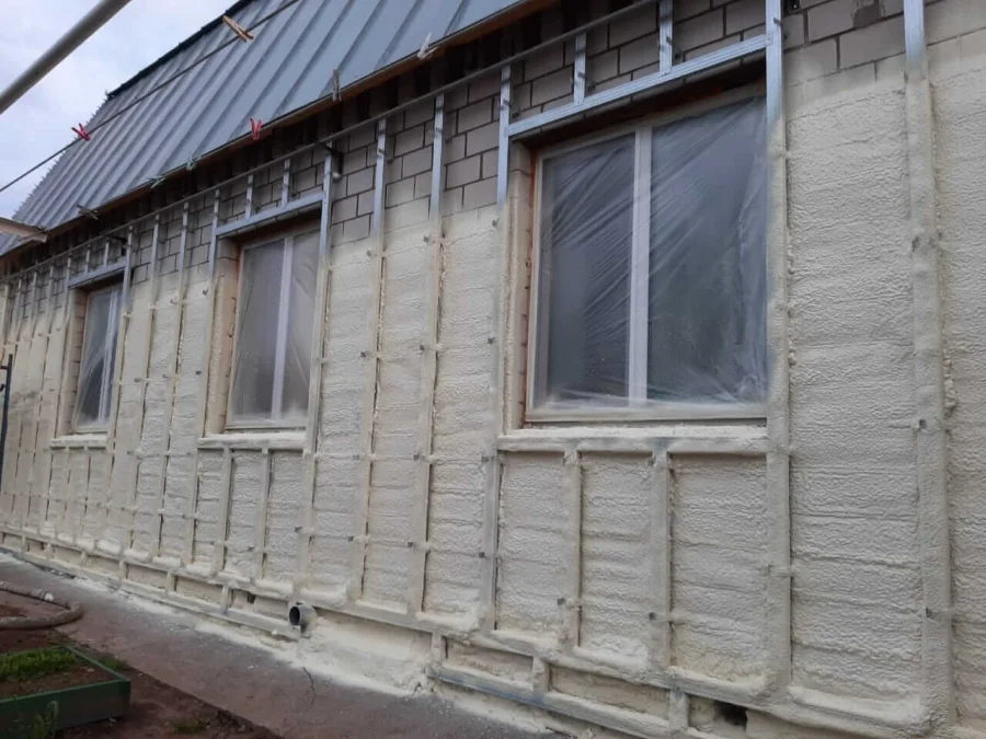 Для утепления фасада подойдет закрытоячеистый ППУ для теплоизоляции наружных и внутренних стен «Химтраст СКН-30 Г3», «Химтраст СКН-40 Г3», «Химтраст СКН-60 Г3». Напыление делают снизу вверх на расстоянии 0,6–1 м при температуре окружающей среды 15–25 °С. Каждый слой наносят плавными движениями, без рывков, пробелов, зазоров. Толщина — не менее 5–7 см.