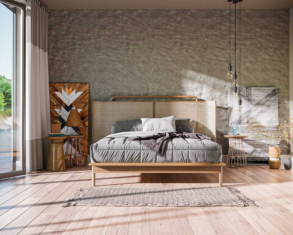 Однако, это не единственная тенденция в модном оформлении пространства спальни 2021. Очень популярен сегодня экостиль, которому придают «расслабляющий эффект». В этом варианте можно оформить всю квартиру, но в спальне он особенно хорош. Нужно использовать только естественные цвета природы, натуральное дерево, соломку, бамбук, лён, хлопок.