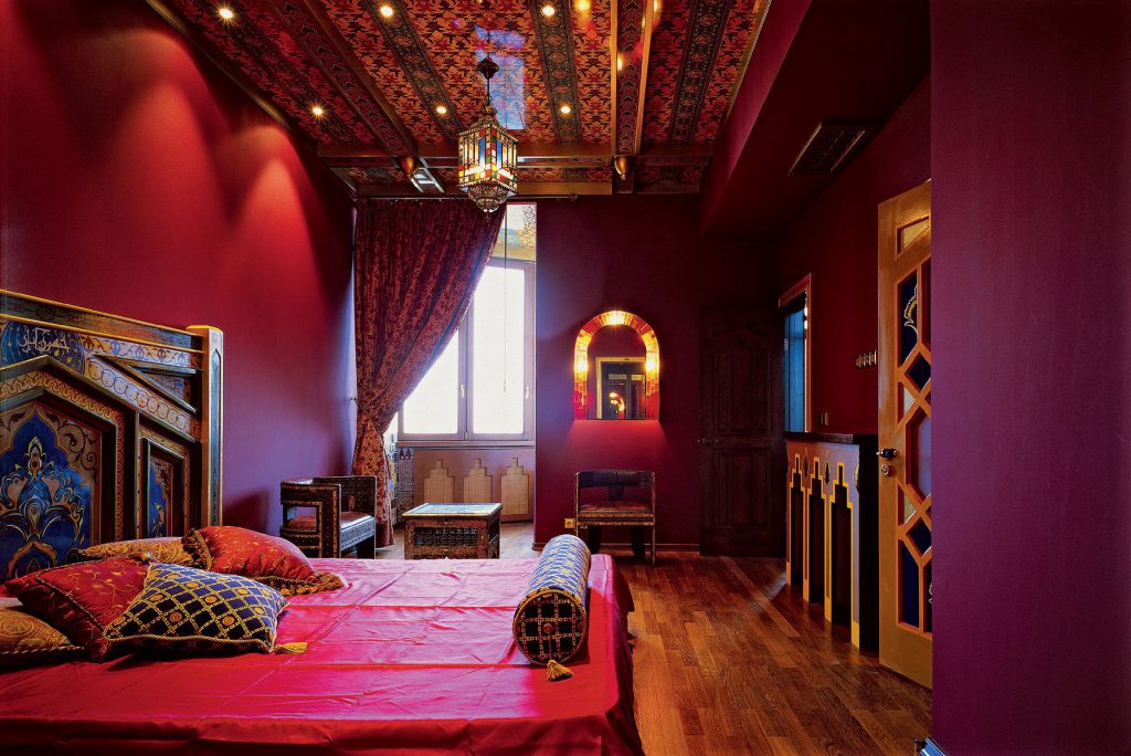 Восточный стиль — используются различные национальные культуры стран Востока (Китай, Япония, Марокко, Индия и др.). Спальня в восточном стиле, представленная на фото в интернете, может оформляться как с использованием национальных элементов одной страны, так и общевосточных принципов. Допускается использовать восточные ковры, бахрому, оригинальные орнаменты, множество разноцветных подушек, различные национальные элементы в декоре (вазы, статуэтки, светильники).