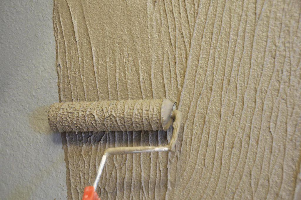 Для этого потребуется выдержка до 10 минут. Следующий этап предполагает прохождение стены валиком для фактурной штукатурки с целью формирования узора. Работать нужно сверху вниз.