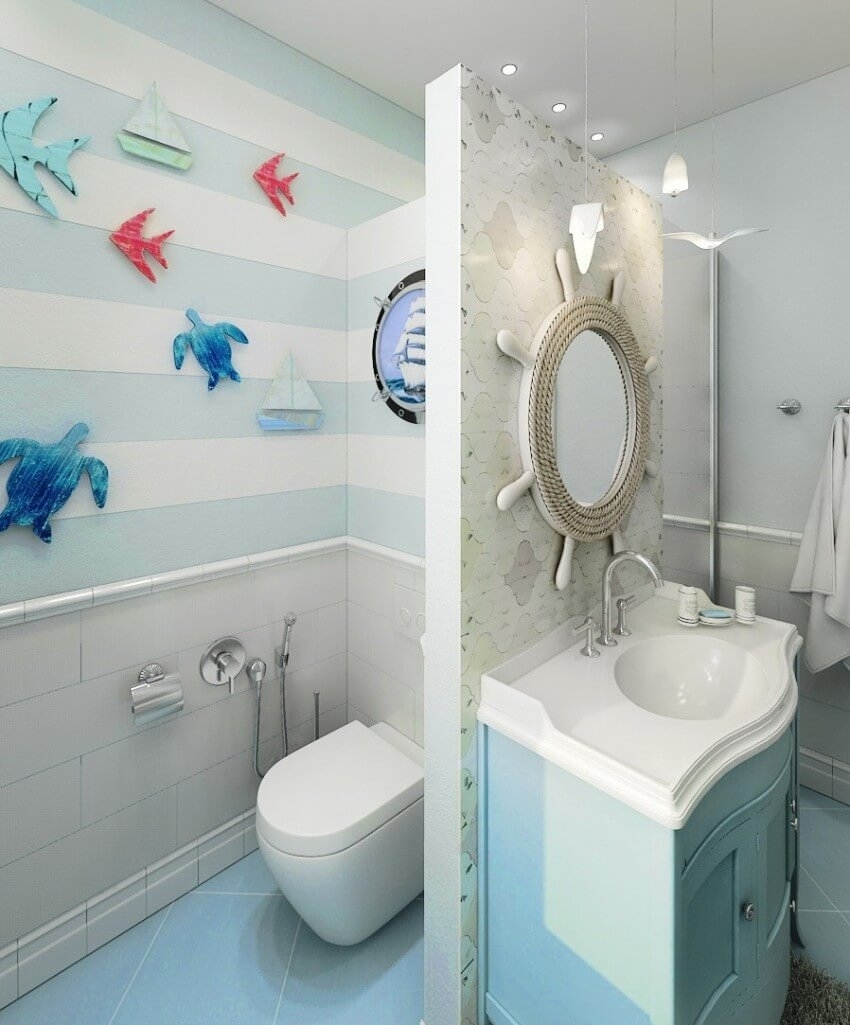 Помогают преобразованию помещения шторы, полотенца, ковры, выполненные из тканей с соответствующим рисунком. Чередующиеся белые и синие полосы — беспроигрышный вариант. Но и смешные дельфины, улыбающиеся киты, пучеглазые рыбки будут уместны, если в семье есть маленькие дети.