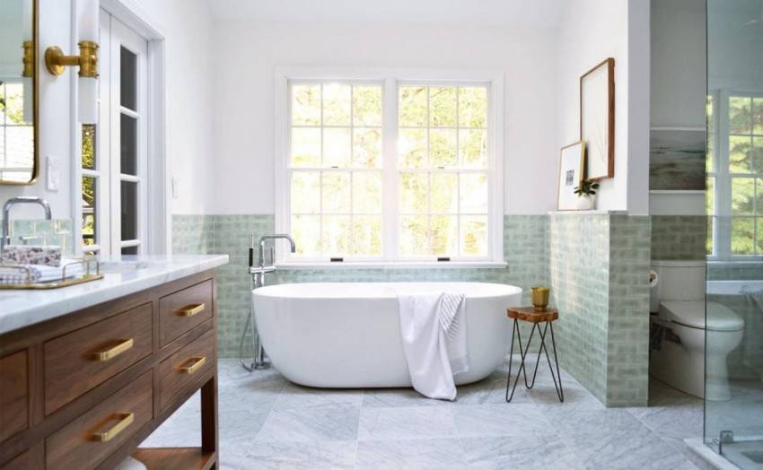 - Светло-зеленый и белый. Это сочетание цветов создает атмосферу природы и свежести. Светло-зеленые стены или плитка могут быть украшены декоративными элементами в виде листьев или цветов, а белые мебель и аксессуары создадут контраст и уют.