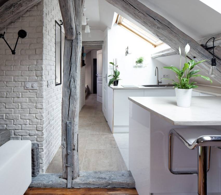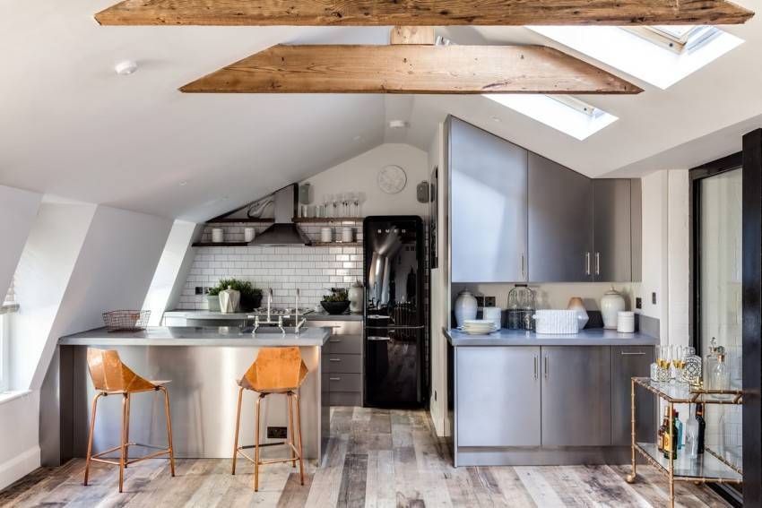 Необычная кухня и столовая на мансарде: фото дизайна
