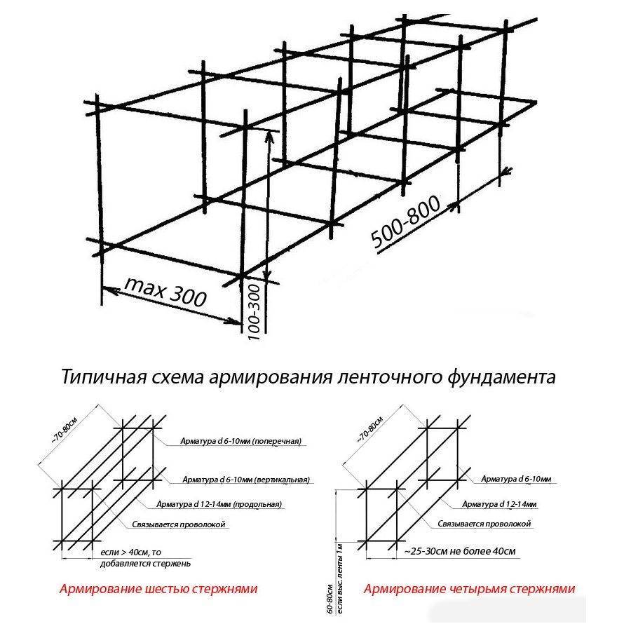 Схема армирования ленточного фундамента — что это такое и как правильно выбрать схему армирования. Что такое схема армирования? Схема подразумевает собой расположение арматурных прутьев в фундаментах. В ленточных основаниях поперечное сечение представляет собой вытянутый по вертикали прямоугольник. Соответственно и армирование фундамента будет таким же. Это самый оптимальный вариант в отличии, например, от квадратной конфигурации. Причина в действующих на фундамент силах, которые давят на него снизу вверх и сверху вниз. Первая — это сила вспучивания почвы при отрицательных температурах. Вторая — сила тяжести постройки. Давление на боковые стороны значительно меньше, поэтому в поперечном сечении ленточный фундамент может быть достаточно тонким.