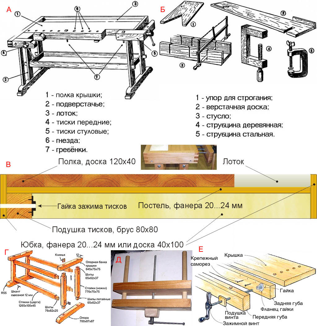 Как устроен столярный верстак традиционного типа, показано на поз. А рис; принадлежности к нему на поз. Б. Верстачная доска (в данном случае это отдельное приспособление) используется для работы с длинномером. Упор в ее пазу делается из подклиненного обрезка доски, см. далее. В доске желательно насверлить продольный ряд отверстий и крепить ее в гнезда болтами с конусными головками впотай. Традиционная конструкция столярного подверстачья показана на поз. Г, но – см. выше.