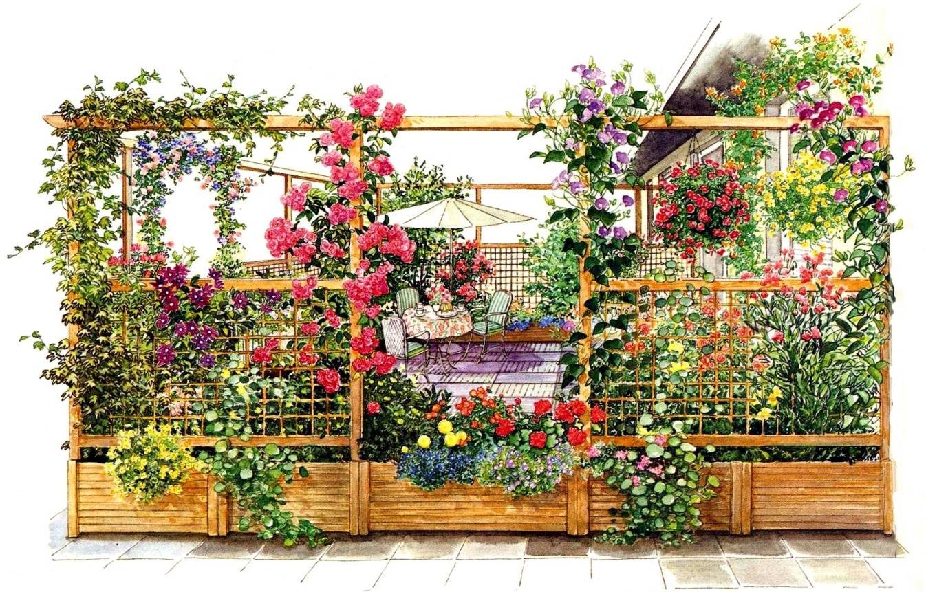- Ширма – решетка или щит с полочками (крючками) для цветочных горшков. Для устойчивости с двух сторон оснащается опорами;