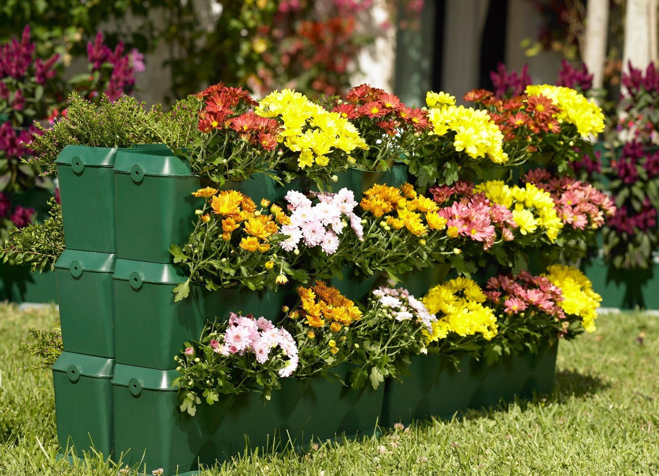 Существуют готовые вертикальные клумбы из пластика. Они представляют собой многоярусные конструкции с ячейками для посадки растений. Некоторые оснащены автоматическими системами полива, упрощающими уход за цветником. Стоимость такого устройства далеко не бюджетная, поэтому многие садоводы довольствуются самодельными клумбами, которые ничуть не уступают магазинным в эстетическом плане и удобстве.