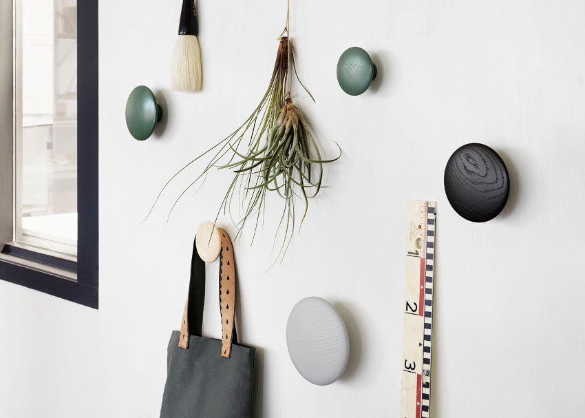 Необычным решением считается применение на стене специальной интерьерной наклейки, к которой затем подбираются крючки, совпадающие по цвету с самими наклейками. Такой вариант является оптимальным для маленького вытянутого коридора.