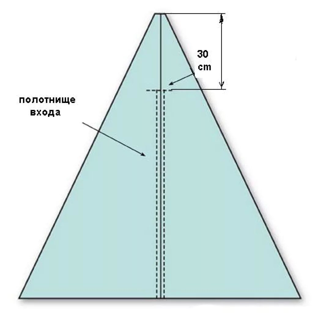 Последующим этапом станет создание тканевого чехла. Можно воспользоваться готовой выкройкой или нарисовать ее самостоятельно. Размер частей вигвама может быть различный