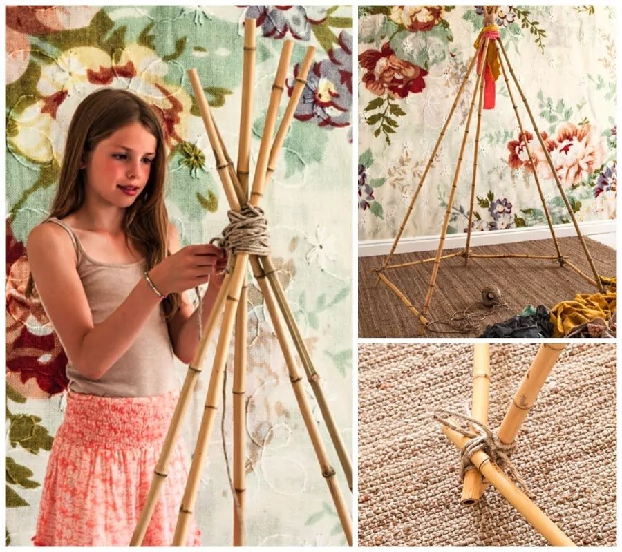 Отличный и нестандартный подход организации вигвама – создание каркаса из . Если у вас дома завалялись обрезки таких конструкции, считайте, что вам повезло.